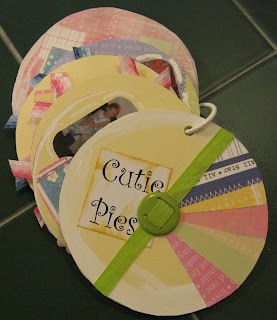 ....whew....and don't forget the leftover scraps. I've been on a mini-book kick lately and had a great time making this little book with more pictures of my smiling nieces and nephews. Mini-books are really easy to put together quickly. I don't have a large circle punch, so I just traced a large bowl for the front and back covers and a smaller bowl for the inside pages and used nearly every bit of leftover paper and ribbon scraps.