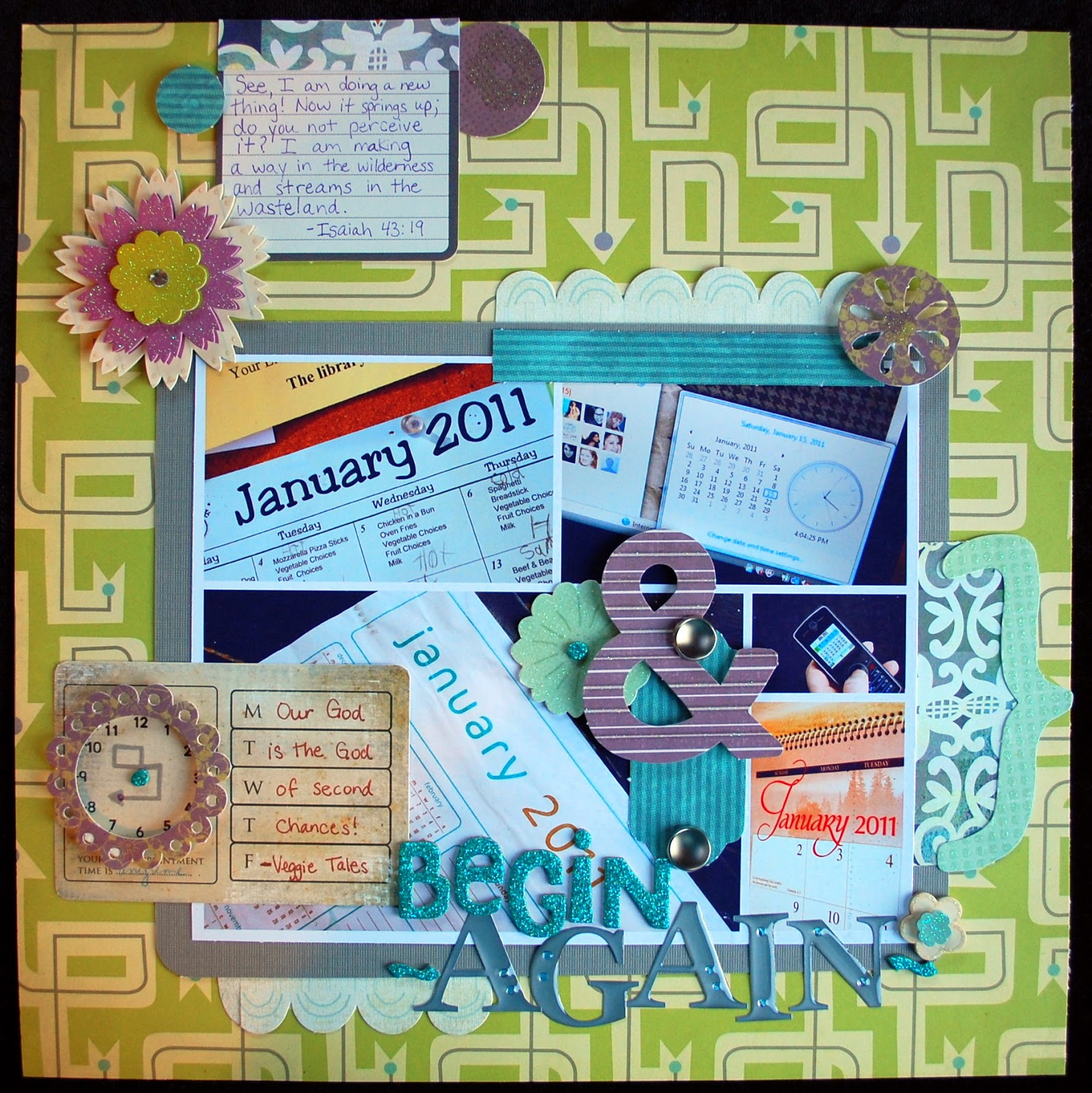 Focusing on my faith and my future, I made a layout in Jan. 2011 that plans for what's ahead. I used an inspiring bible verse (plus a quote from Veggie Tales) and a collage of photos where I see calendars throughout my day. The papers and accents I used were definitely a mish-mash of a WIDE variety of products I've purchased through the years... no rhyme or reason except using up the old so I can move on to the new. (I thought that was a suitable tie-in to my layout theme too!)